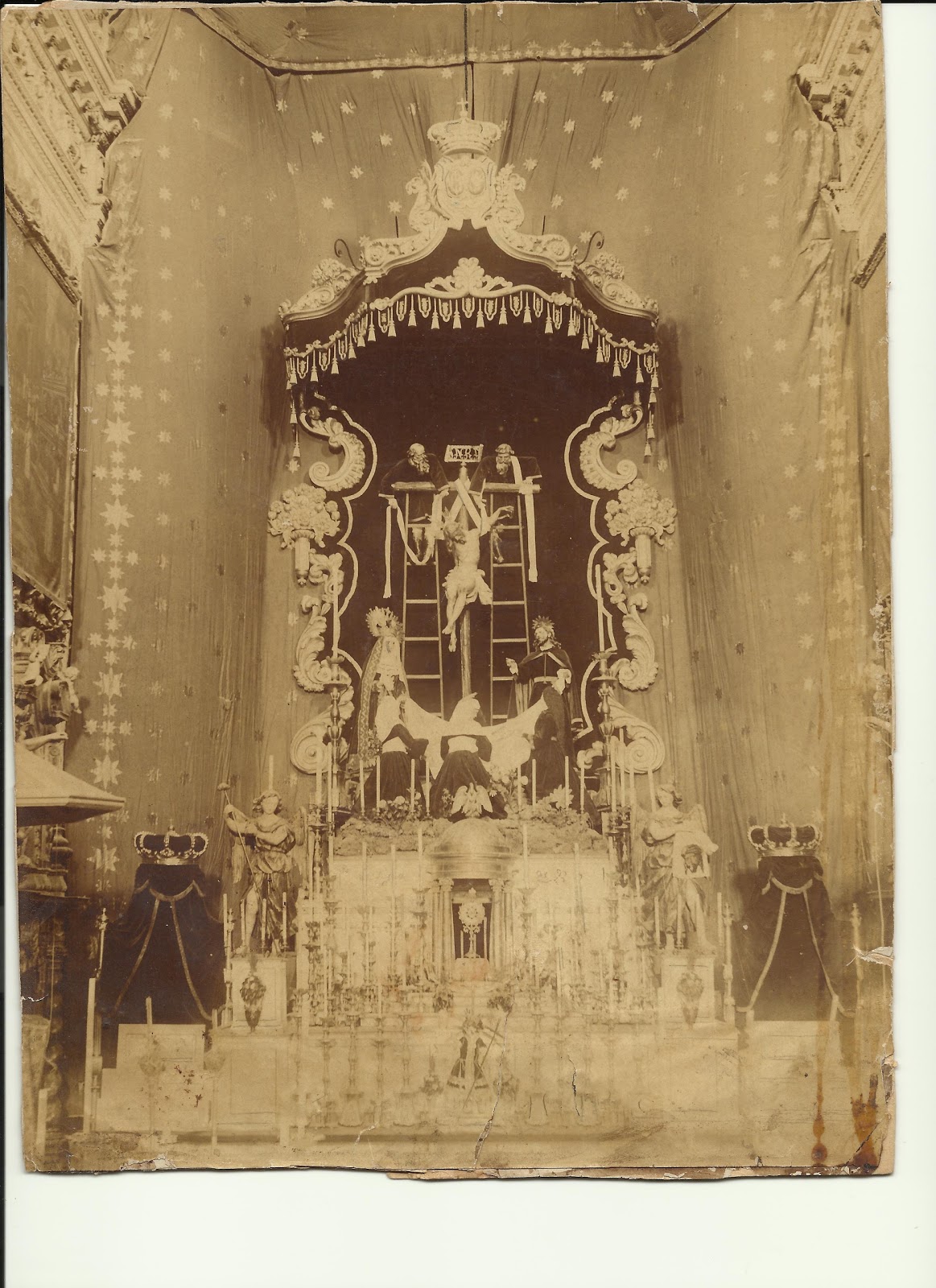 Como curiosidades de la fotografía, indicar que en el Misterio figura la antigua Virgen de la Quinta Angustia que viste un manto que hoy no se conserva. El sudario del Cristo se colocaba de una forma peculiar y basta mirar como lo sostiene el Santo Varón Nicodemo. El San Juan lleva el mantolín a modo de capa. La Magdalena lleva el pelo natural que le sustituye Vicente Rodríguez Caso por el pelo tallado en 1939. El Dulce Nombre de Jesús preside el altar como culto en Honor a todos los Titulares, y viste una túnica que igualmente no se conserva, y tras el, se situa el templete de nuestra propiedad, que aún se conserva en las dependencias parroquiales y que está coronado por el pelícano que simboliza el amor y que nos talló Juan de Astorga. Los ángeles del Taller de Roldán que flanquean el altar, muestran en sus manos el paño de la Verónica, y la esponja de la que dan a beber a Jesucristo en la Cruz.